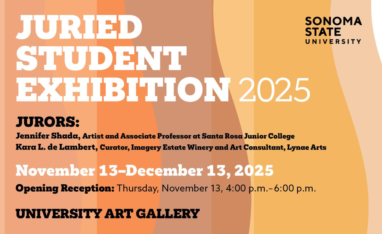 The work in the exhibition will be selected by two distinguished art professionals: Kara L. de Lambert, Curator at Imagery Estate Winery and Art Consultant at Lynae Arts; and Jennifer Shada, Artist and Associate Professor of Art at Santa Rosa Junior College. Both jurors bring exceptional expertise and insight to the selection process and will engage with students and the campus community through a Juror's Talk, where they will discuss their professional practices and perspectives on contemporary art.